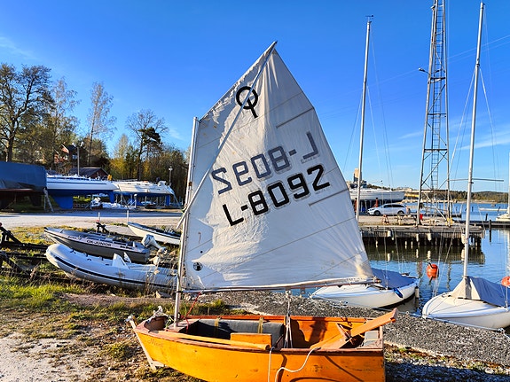 Optimisti jolla, lakattua puuta, optimistilla voitettu Suomen mestaruusmitalli