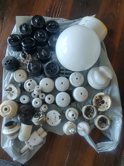 Sekalainen erä vanhoja posliinisia sähkökalusteita