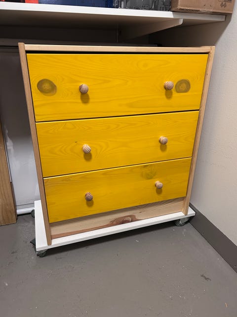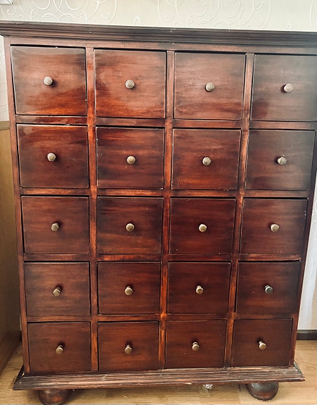 Ruskea lipasto pienillä laatikoilla