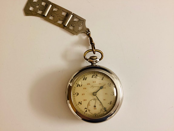 Leijona taskukello hopeakuori ,metallikotelo, kelloperät