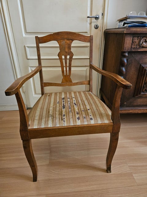 Puinen käsinojallinen tuoli verhoillulla istuimella