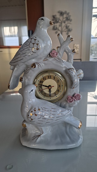Keraaminen pöytäkello lintukoristeella valkoinen