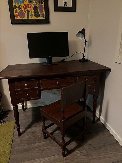 Vanha tummanruskea puinen kirjoituspöytä ja tuoli