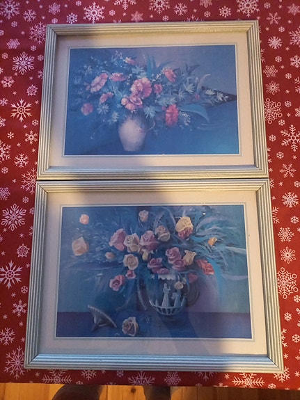 Siirry hakutuloksiinKaksi taulua kukkakuvioilla harmaat kehykset ja lasi