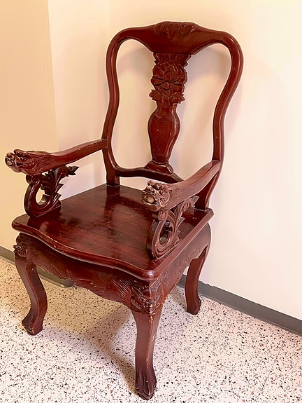 Puinen nojatuoli punaisella kangasistuimella