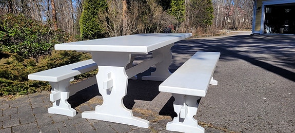 Puinen ruokapöytä penkeillä