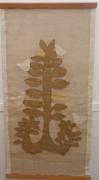 Vintage pellava kuultokudos puu ja linnut Helmi Vuorelma ?
