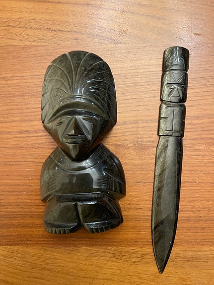 Käsintehty koriste-esine ja veitsi mustasta kivestä