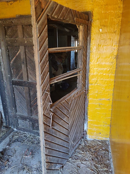 Ovia ja hirsiä purettavasta rakennuksesta