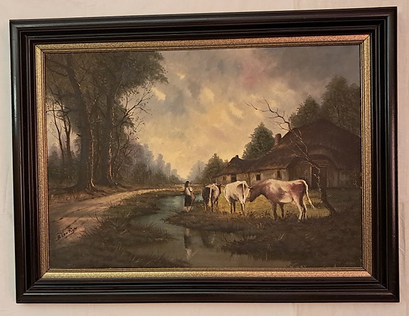 Upea ja suuri öljyvärimaalaus – Hollantilainen jokimaisema (B. van Rijn)