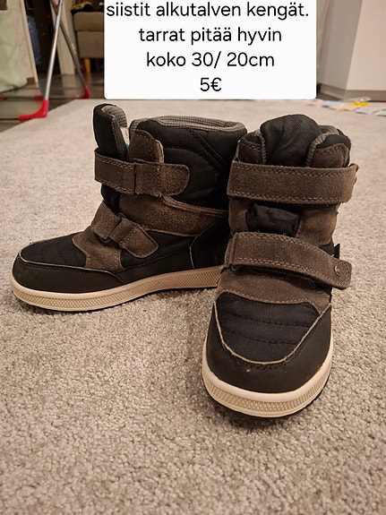 Lasten talvikengät voi löytää usein edullisemmin käytettynä. Torissa on nytkin 6 591 ilmoitusta, joissa myydään erilaisia lasten talvisaappaita ja -kenkiä. Parhaat lasten talvikengät ovat luonnollisesti keliin sopivat. Lauhalla ja märällä talvisäällä tarvitaan kengät, jotka suojaavat kosteudelta. Kireällä pakkasella monen mielestä kaikista parasta lapsen jalkaan voivat olla nahkaiset, villavuoriset kengät. Kannattaa myös laittaa pieneksi jääneitä lasten talvikenkiä aktiivisesti kiertoon ja antaa muiden kokea löytämisen ilo!