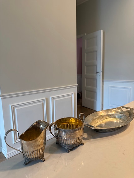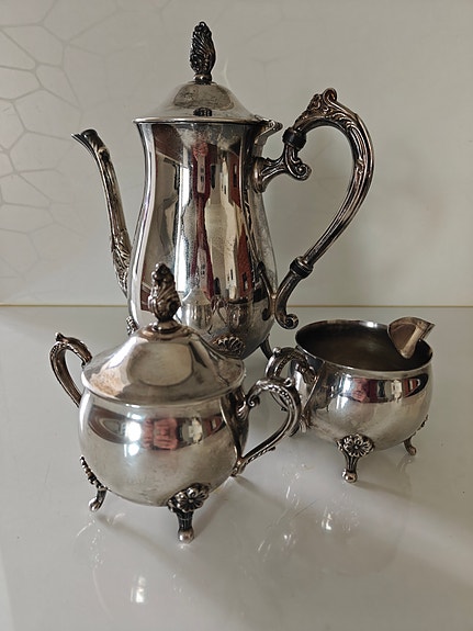 Hopeoitu kannu, sokerikko ja kermakko