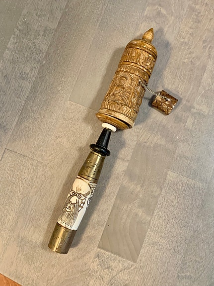 Antiikkinen Tibettiläinen rukousmylly – kaiverrettu luukahva, käsityötä