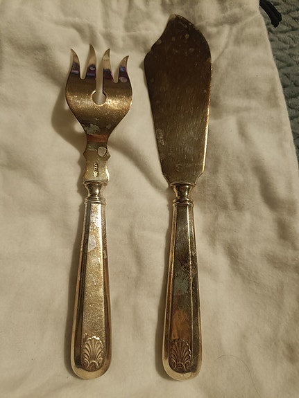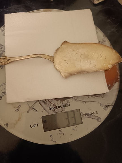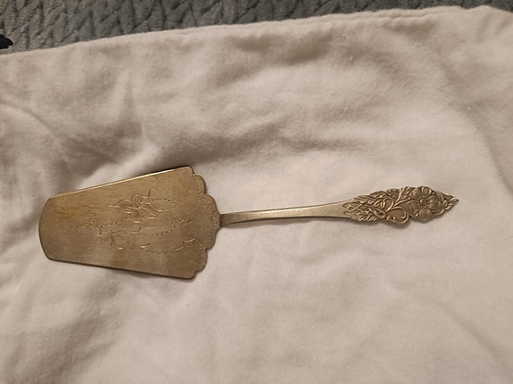 Musla hopeoitu kakkuhaarukka ja lapio