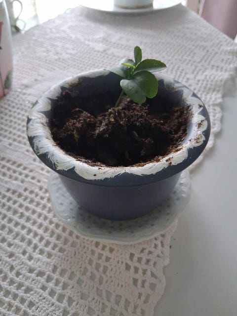 Pieni viherkasvi muoviruukussa mandariini