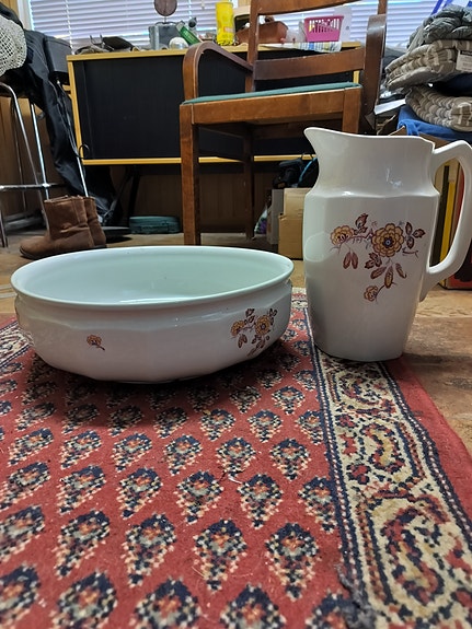 Posliininen kannu ja vati kukkakuviolla