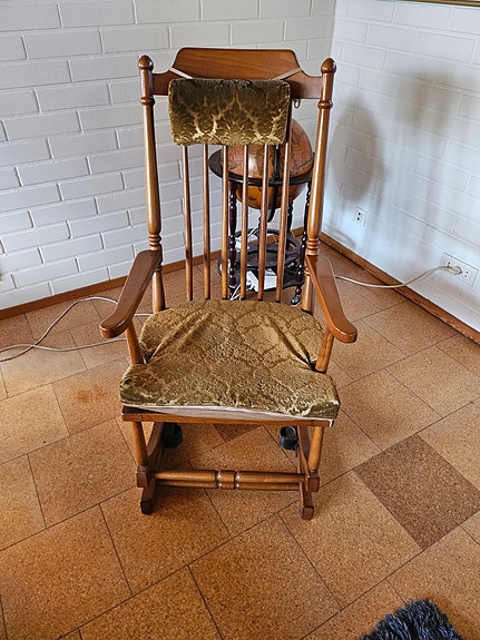 Siirry hakutuloksiinPuinen keinutuoli ruskeilla pehmusteilla