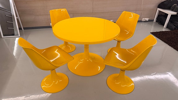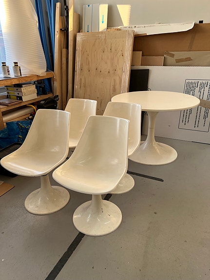 Asko – 1970-luvun lasikuitukalusto (pöytä + 4 tuolia), HIENO!
