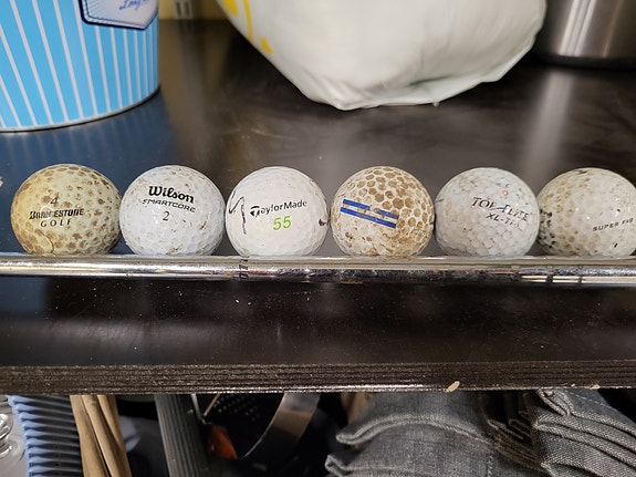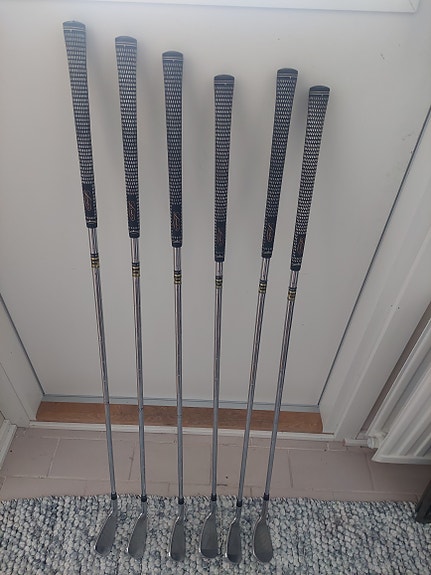 Setti sekalaisia golfmailoja erikuntoisina