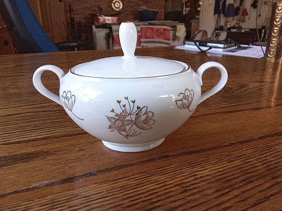 Posliininen sokerikko kannella valkoinen kultakoristeinen
