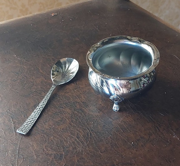 Hopeinen suola-astia v 1901 ja lusikka