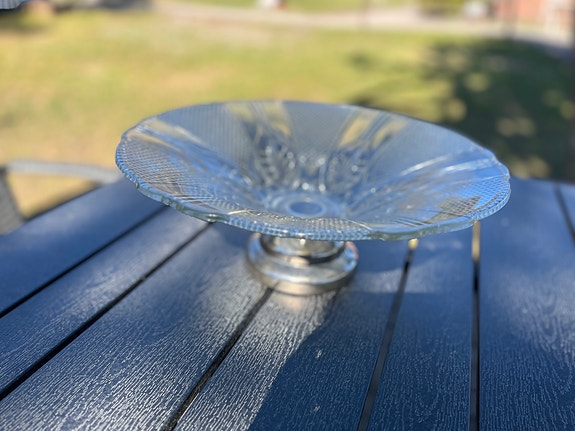 Lasinen jalallinen tarjoiluvati kirkas