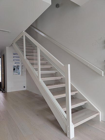 Suorat valkoiset massiivipuuportaat lasikaiteilla