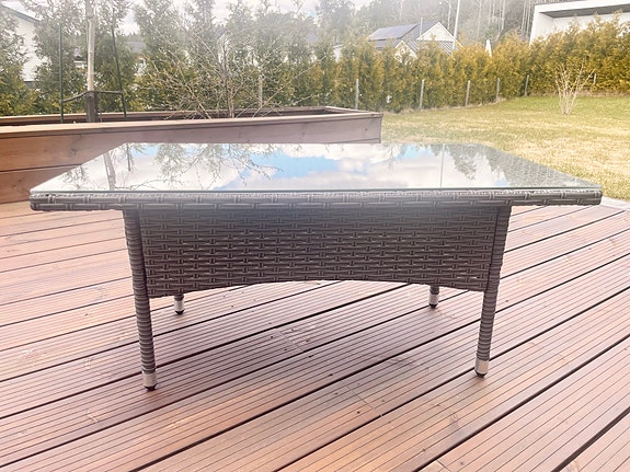 Harmaa polyrottinkinen terassikalustesetti pöydällä