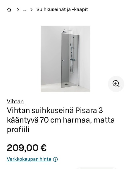 Suihkukaappi sisältää altaan ja suihkua ympäröivät seinät, jotka suojaavat muuta kylpyhuonetta vedeltä. Jos suunnittelet suihkuseinän tai -kaapin ostamista Torista, kannattaa ilmoituksia selatessa katsoa luonnollisesti esimerkiksi mitat, onko ovi tai seinä taittuvaa mallia ja tuleeko mukana esimerkiksi sekoittaja.