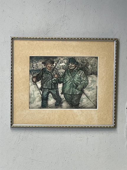 Taulu ”Hiihtävät metsästäjät” etsaus, O Räisänen -29