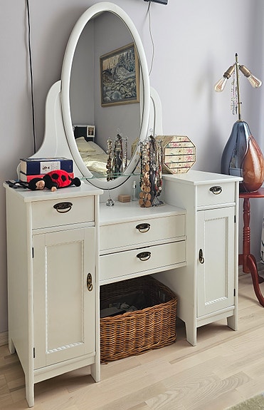 Valkoinen kampauspöytä peilillä ja säilytystiloilla