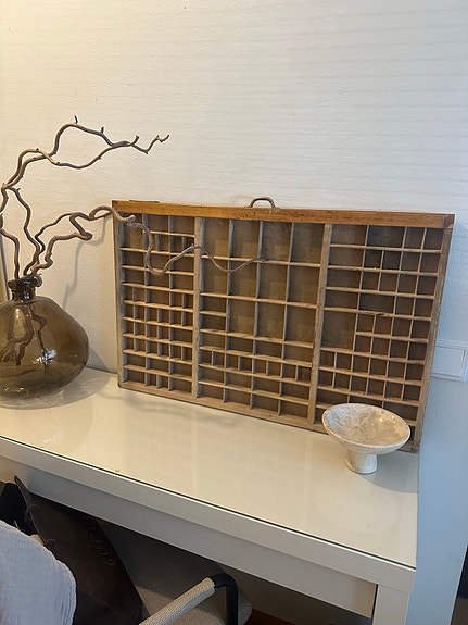 Puinen kirjapainolaatikko / lokerikko seinälle