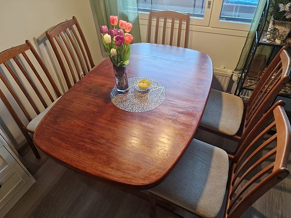 Hugo Frandsen Spøttrup 1960 Tanskan tehdäs teak ruokailuryhmä, Skovby ruokapöytä