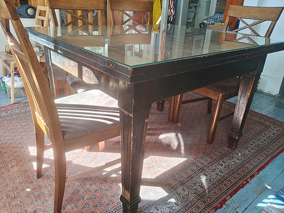 Vanha tamminen jatkopöytä + 6 tuolia (4 kpl + 2 kunnostettavaa)