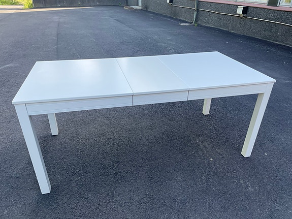 Valkoinen jatkettava ruokapöytä metallijaloilla