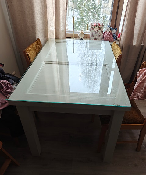 Valkoinen puinen ovipöytä lasikannella