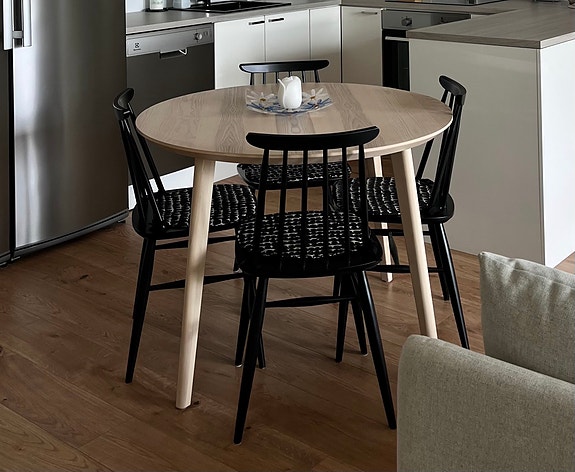 Siirry hakutuloksiinPohjanmaan kalusteen 140x140 ruokapöytä ja Askon ruokatuolit