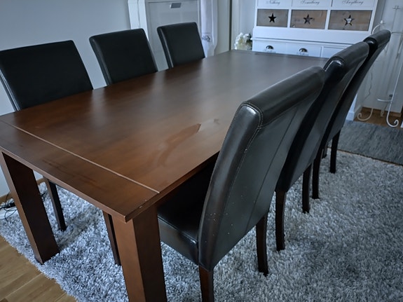 puinen pöytä ja 6 tuolia