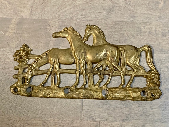 Antiikkinen messingistä valmistettu seinäkoriste hevosilla