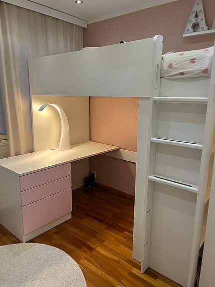 VARATTU/IKEA parvisänky työpöydällä ja säilytystilalla valkoinen vaaleanpunainen