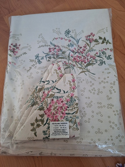 Myydään vintage pöytäliina + servetit (avaamaton paketti)