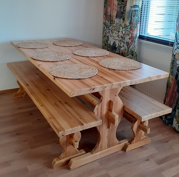 Puinen ruokapöytä ja penkit