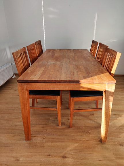 Tamminen ruokailuryhmä, ruokapöytä (180 x 89) ja 8 tuolia