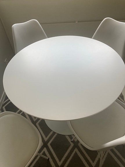 Pyöreä, tulppaani-tyyppinen pöytä ja neljä tuolia