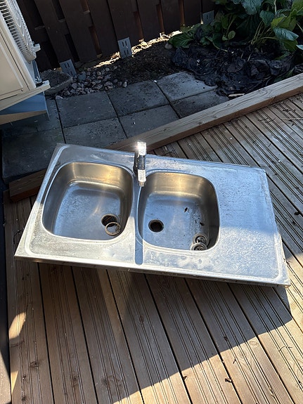 Ruostumaton teräs keittiön tiskipöytä kaksoisaltaalla ja hanalla