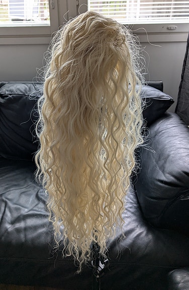Pitkä vaalea peruukki laineikkaalla hiuksella