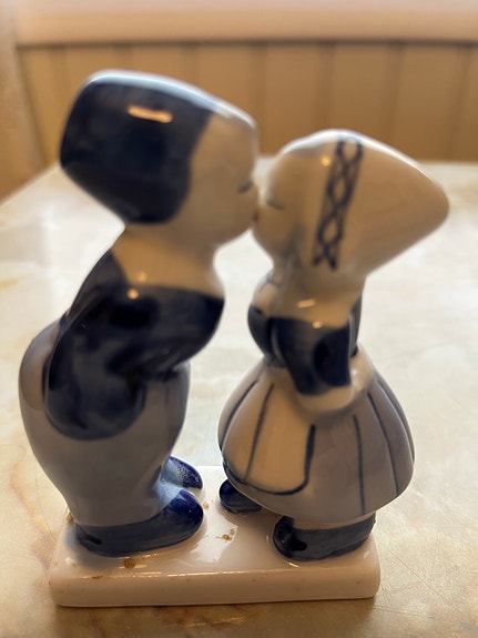 Posliininen suuteleva hollantilaispari figuuri sinivalkoinen