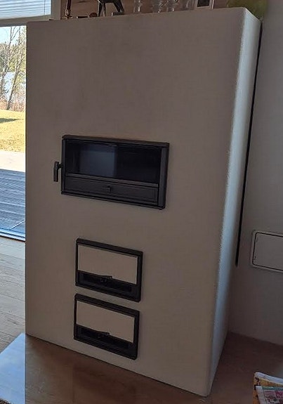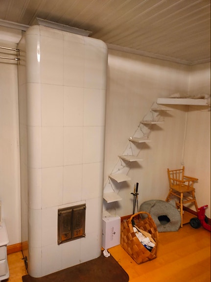 Valkoinen kaakeliuuni metalliluukuilla