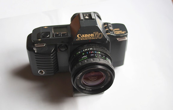 Myydään Canon T70 + Vivitar 24mm f/2.8