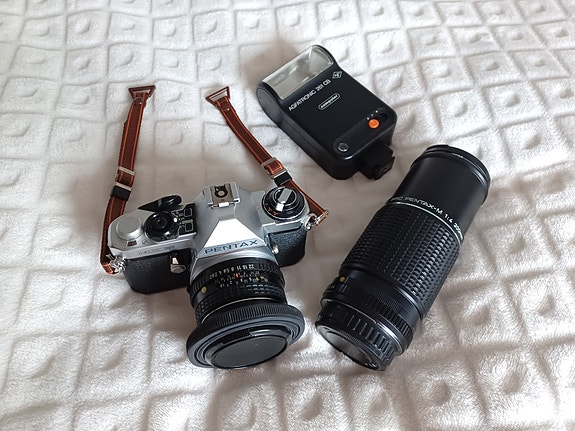 Pentax ME Super filmijärjestelmäkamera objektiiveilla ja salamalla